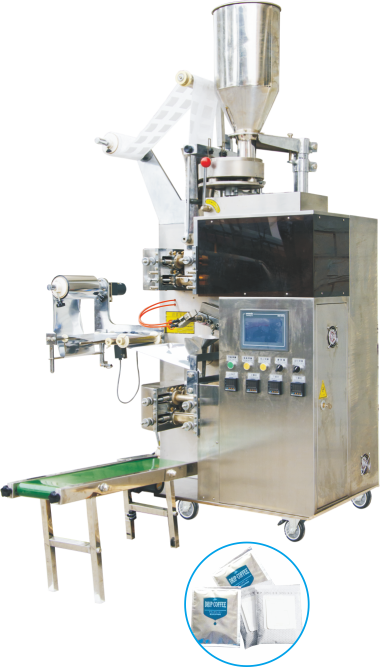 本機特點:本機是一種新型熱封式,多功能全自動袋泡茶飲品包裝設備。該機的主要特點是內外袋一次成型,避免了人手與物料的直接接觸。內袋為掛耳咖啡專用濾紙。其好處在于:貼標和外袋均可采用光電定位,包裝容量、內袋、外袋均可任意調整,可根據用戶的不同需要來調整內外袋尺寸,以便達到理想的包裝效果,提高產品外觀檔次,使產品價值提升。